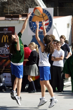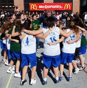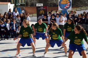 Están en cuartos. Tiene esta misma tarde a las 19: 00 un partido de locos, un partido no apto para almas sensibles, un duelo sin cuartel. Las chicas de Pureza de María se juegan los cuartos, y el pase a la semifinales contra una de sus grandes rivales zonales…y encima en su guarida Efectivamente, a pocos metros de su cole, atravesando Doctor Esquerdo, las Tigresas de Santa María del Pilar esperan con las garras muy afiladas dispuestas a defender su territorio ante cualquier intruso. Está claro, si vas a enfrentarte a las Tigresas, hace falta algo parecido… ¡Señores y Señoras, con todos ustedes las Panteras de Pureza de María! Y para presentar el equipo, para presentar a las Panteras y para caldear el ambiente para el partido de esta tarde, que mejor que organizar un Joe´s High School Basketball Experience, el mega pep-rally con Joe Arlauckas como invitado especial, y con todo el colegio apoyando a sus Panteras. Y eso hicimos. Hoy a las 12;00, el patio del cole fue un hervidero de baloncesto, de canastas, defensa, triples, partidos…hubo incluso un tremendo mate. Con Joe, demostrando que sabe perfectamente como motivar a un grupo de jugadores que están ante uno de los partidos más importantes de su carrera, un partido que, ganen o piiiiiiiii……, (esto último, ni mencionarlo) siempre recordarán, y dirigiendo unos drills que sirvieron para dejar constancia de que estas jugadoras, estas Panteras van a dejar muy alto muy alto el pabellón de Pureza. Y un 10 a la respuesta de los compañeros de cole, que se volcaron animando a su equipo, y que seguramente esta tarde estarán en la Guarida de las Tigresas, apoyando a sus jugadoras hasta la extenuación… Sin duda, una maravillosa mañana de baloncesto que tuvo su punto álgido en un partido Panteras vs Panteras con Joe de center , y con la mismísima Hermana Virginia haciendo el saque de honor… Y llegó el turno para los discursos motivacionales, recibido por todos los chavales con grandes aplausos .En primer lugar dos personas que hacen que todo esto sea posible, Ruy González en nombre de McDonald´s y Alberto López-Ribe , Presidente de la ABC. A continuación, turno para Pureza de María, con la Hermana Virginia demostrando que es la primer fan de Pureza y con Lucia Martínez, capitana del equipo acompañada de la gran ex jugadora colegial Marian Villarta , Best Student Athlete del 2010, animando a sus jugadoras y seguidores …tambien unas palabras del gran Joe … ¡¡Y el Himno de Batalla de Pureza para acabar!!! Esto ha sido todo…¡ahora toca salir a la cancha y dejarse la piel por el escudo de tu colegio! Go Pureza! Digo…Go Panteras! …mejor Go Panteras Pureza!!! Menudo duelo de felinas nos espera.