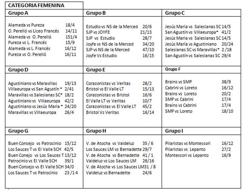 Categoria Femenina: Alameda , San José del Parque, San Agustín, Agustiniano, Corazonsitas, Brains, Lo sSauces Torrelodones, Virgen de Atocha, Pilaristas, Obispo Perelló., Joyfe, Maravillas, Bristol, SMP, Patrocinio **, Los Sauces LM