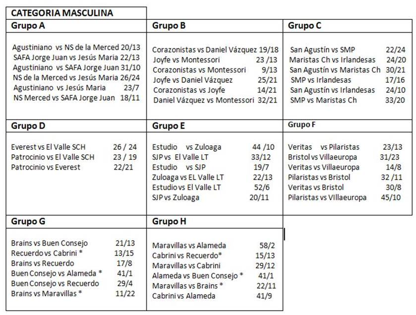 Categoría Masculina : Agustiniano, Joyfe, SMP, Buen Consejo; San José del Parque, Everest,Estudio,Veritas, Patrocinio, Maravillas, Montessori, SAFA Jorge Juan **,Brains, San Agustin, Patrocinio,Pilaristas,Cabrini