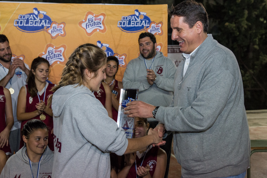 El partido, como todo el mundo conoce, acabó con victoria por 56-35 para un equipo que no era favorito, pero que jugaba con ventaja y esa ventaja era el no poder contar, por desgracia con una de sus líderes. Cosas de la vida. Cuando los árbitros pitaron el final del partido había un ambiente especial, era una victoria muy trabajada, que además de ir dedicada a todo el colegio que animó hasta la saciedad, era por una persona que se había machacado como nadie por poder estar. Estuvo, pero no pudo aguantar, y por eso fue ella la elegida para recoger el trofeo de CAMPEONAS de la Copa Colegial y Bifrutas 2015 en manos de Enrique Fernández, un auténtico pilar en el baloncesto colegial malagueño con aquel Mayoral Maristas. No se lo podía creer. “Tuve ese privilegio, pero como nos dijo nuestro coordinador, tan solo éramos una pequeña representación de todos los jugadores que practican baloncesto en Asunción”, nos dice un día cualquiera de entrenamiento pero ya con la medalla de oro en el cuello.