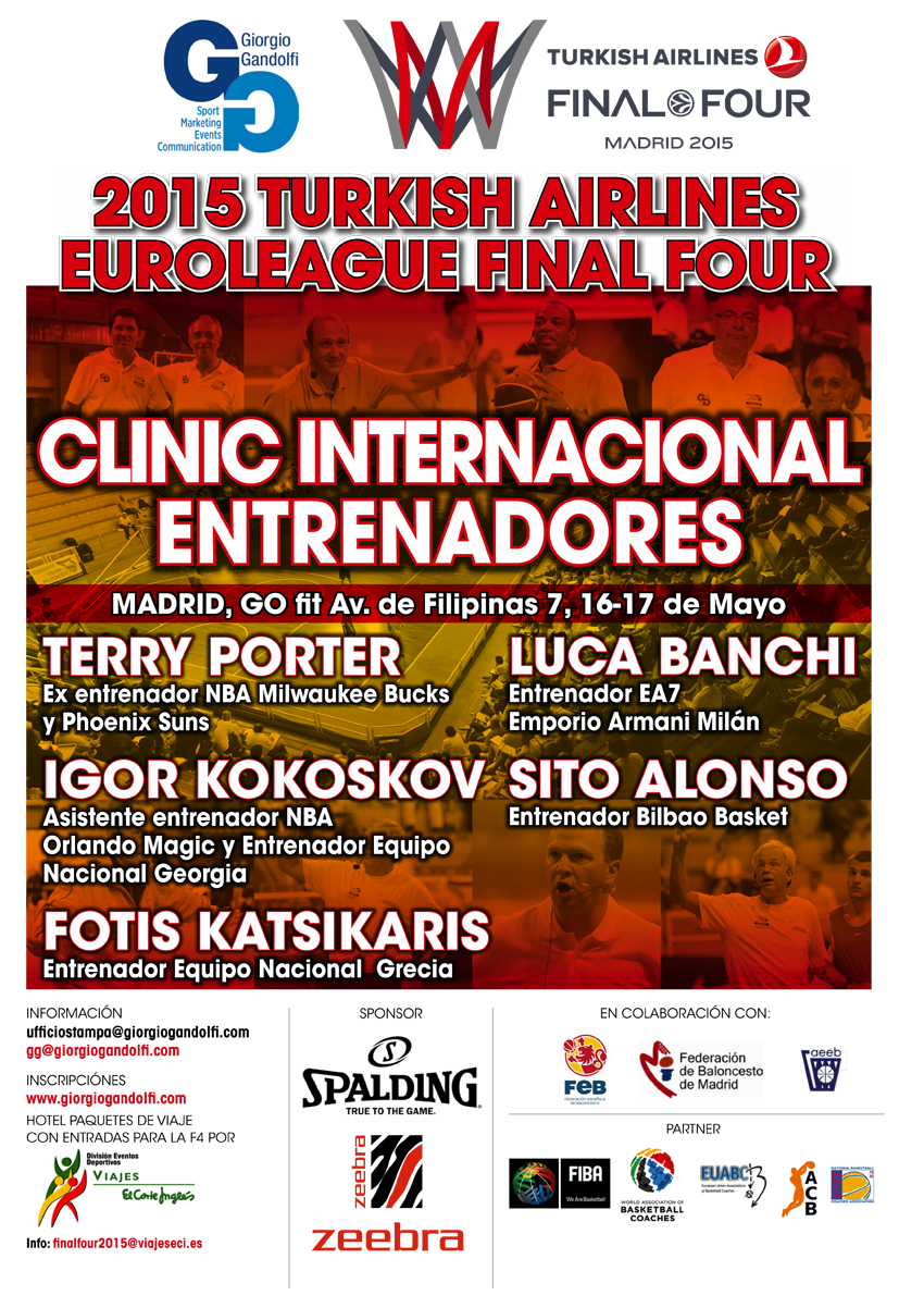 Con motivo de la celebración de la Final Four de la Turkish Airline Euroleague 2015 en Madrid, el evento irá acompañado del Clinic Internacional de Entrenadores que contará con las ponencias de Terry Porter, Igor Kokoskov, Fotsis Katsikaris, Luca Banchi y Sito Alonso. La actividad tendrá lugar los días 16 y 17 de mayo en el Go Fit de Av Filipinas, 7. Sin duda, se trata de una oportunidad para todos los amantes del baloncesto de conocer este deporte de la mano de grandes profesionales que han entrenado o que siguen en activo tanto en la Estados Unidos como en Europa.