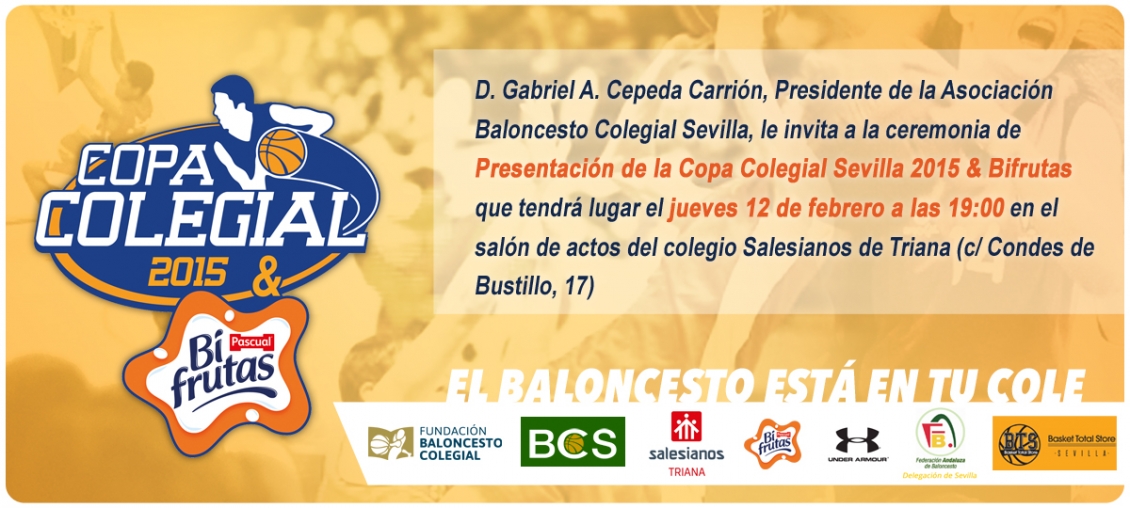 Recuerda. El jueves 12 de febrero a las 19 h tienes una cita en el colegio Salesianos de Triana. ¡No faltes! La presentación de la Copa Colegial & Bifrutas Sevilla 2015 te espera.