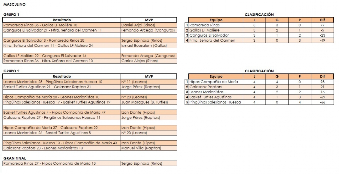 En lo deportivo, muy buen ambiente entre los participantes, gran nivel competitivo de los 17 equipos presentes, y dos pesos pesados que se alzaron con el título. Tras la fase clasificatoria, Romareda Rinos e Hipos Compañía de María llegaron a las dos finales y se repartieron los trofeos. Rinos se impusieron en el torneo masculino e Hipos en el femenino, curiosamente, con el mismo resultado en ambos partidos: 28-17, en un caso para los rojillos y en otro para las chicas de Compañía de María. Destacar la gran deportividad que se vivió entre todos los participantes, así como el debut de los colegios Nuestra Señora del Carmen y Salesianos Huesca en la Copa Colegial & Bifrutas de Aragón, así como el retorno de Calasanz Raptors tras no haber competido en la edición de este año.