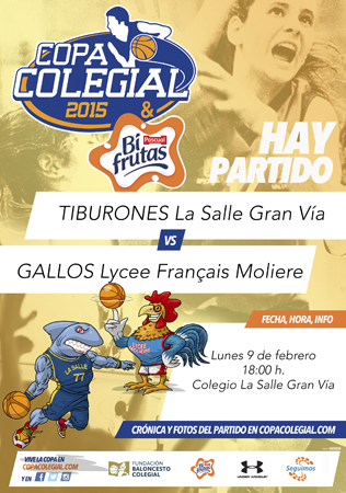 El lunes, el pabellón de La Salle Gran Vía será testigo desde las 18:00 horas del duelo entre Tiburones y otro de los debutantes de 2015: Gallos Lycee Français Moliere. Los Tiburones quieren refrendar su buena actuación de 2014, liderados por Adrián Blancas y Carlos Villén, destacando el 1,90 de Guillermo Pozo que también repite del equipo cuarto finalista. Por su parte, los Gallos presentan un equipo formado por jugadores jóvenes y de altura, con 8 de sus 11 fichas superando el 1,80. Los del Lycee Français Moliere tienen ganas de estrenar su participación en Copa Colegial con una victoria.