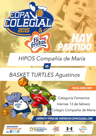El segundo partido de la jornada medirá a las 19:15 horas en el pabellón de Compañía de María a Hipos contra Basket Turtles Agustinos. Las locales, con la All Star 2014 Cristina Vecino como jugadora más destacada de la pasada Copa Colegial, mantienen a varias veteranas que darán poso al equipo. Habrá que estar atentos al rendimiento de jugadoras de nivel reconocido, como Paloma Briceño, Vicky Gasca o Ángela Callave, junto a otras jugadoras aun en edad cadete. Por su parte, las jóvenes jugadoras de Basket Turtles, que causaron una gran impresión en su debut del Primer Viernes ante Tigresas Teresiano del Pilar, tratarán de dar la campanada venciendo nuevamente en territorio enemigo. Para ello contarán con la dirección de la MVP Under Armour del partido, Paula Duque, y será decisiva la continuidad en el juego interior de su pívot Ana Gómez (12 puntos + 5 rebotes en su estreno).