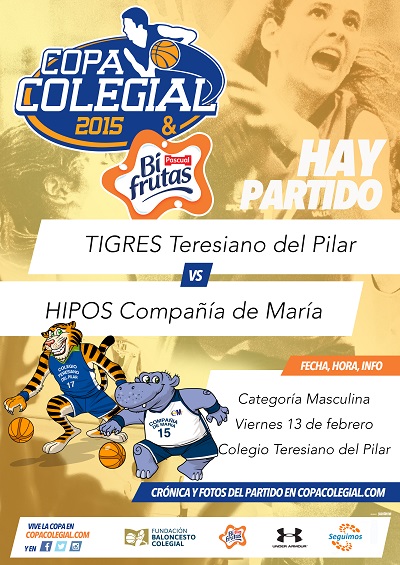 En chicos, los Cuartos de Final se estrenan en el colegio Teresiano del Pilar. A las 17:45 da comienzo el partido entre Tigres e Hipos Compañía de María. Los locales contarán nuevamente con la aportación del siempre espectacular Alberto Espelosín que tendrá como escuderos a Pablo Fabián o Juan Domingo Nerín, quienes intentarán llevar a los Tigres por primera vez en su historia a las semifinales de la competición. Hipos presenta este año un equipo muy renovado respecto al que compitió en 2014, con una plantilla en edad cadete que promete grandes éxitos en el futuro. Pero ojo al presente, porque muchos de ellos ya tienen experiencia del año pasado, donde destacaron los Pablo Baraza, Ángel Emperador o Juanma Gómez, quienes carecerán de la tutela de los "Quinteto Bifrutas" Barco o Liébana, destacados en 2013 y 2014.
