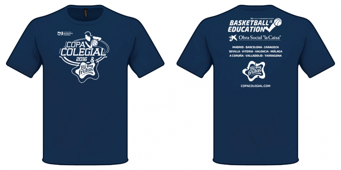 Con una elegante combinación de blanco sobre azul marino, con el logo de Copa Colegial & BIfrutas en el frontal y Basketball is Education Obra Social La Caixa en la espalda, la Camiseta Oficial Copa Colegial 2016 en breve estará en todas las canchas colegiales