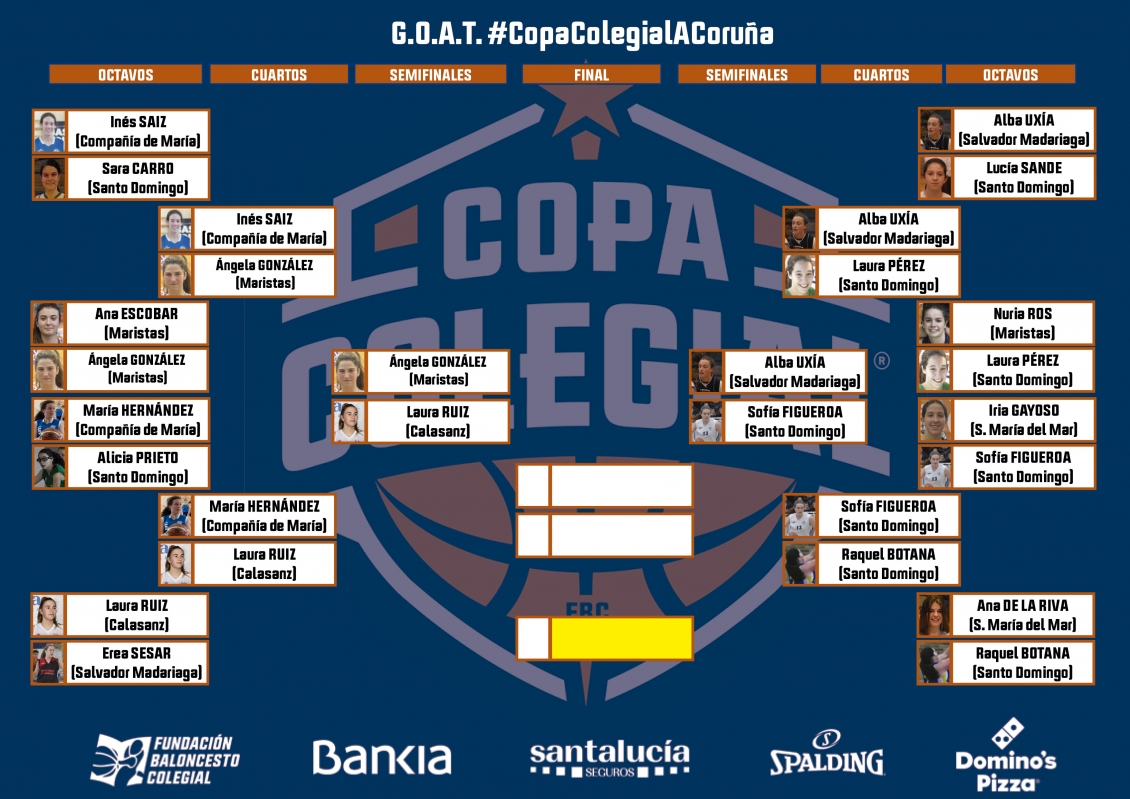 Tras la disputa esta semana de los cuartos de final, llegamos a la recta definitiva en las votaciones del G.O.A.T. (Greatest of all times) de la Copa Colegial A Coruña. Solamente ocho elegidos se van a enfrentar los próximos días para obtener sus puestos en las finales masculina y femenina de la competición que encumbra con tan honorífico premio a un solo jugador y una sola jugadora.