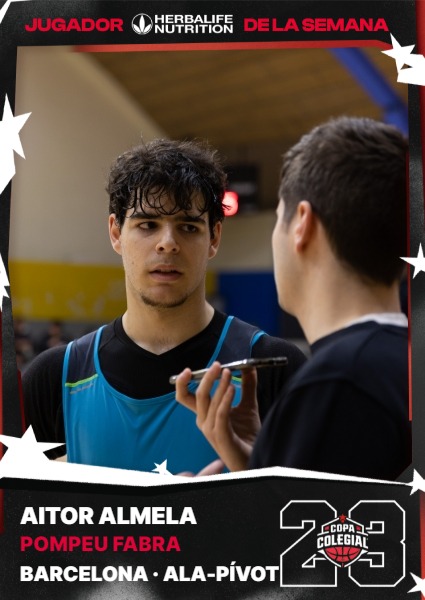 Terminada la tercera semana de la Copa Colegial, este ha sido uno de los MVP's Herbalife más semana al apenas haber competencia. Aitor Almela, jugador de la escuela Pompeu Fabra, se cascó un partidazo en La Plana de Badalona con 26 puntos y 10 rebotes, siendo así clave en la victoria de los de azul en el derbi de Badalona. Su rival, Maristes Badalona, a punto estuvo de dar la sorpresa remontando 16 puntos de diferencia. Pero en el tramo final, Almela también fue clave: un tapón suyo a falta de menos de un minuto acabó con todas las opciones de Champagnat. Se une así al selecto club de MVPs, formado ya por Pol Colominas (Lestonnac) y Max Pou (Sant Ignasi) en el apartado masculino.