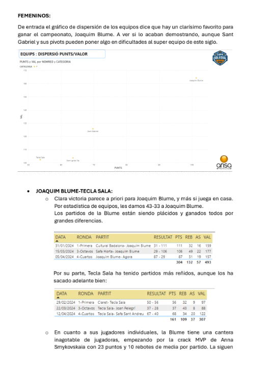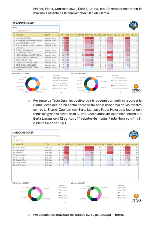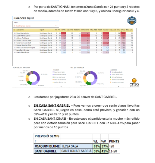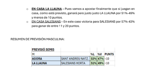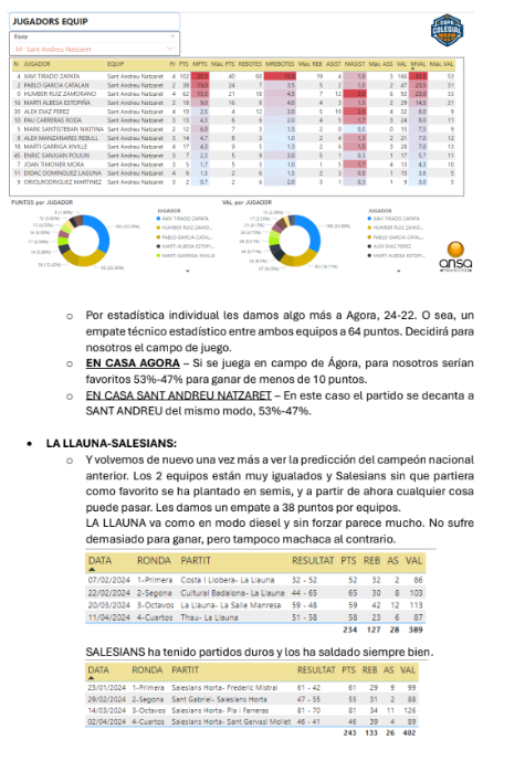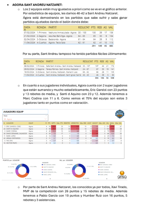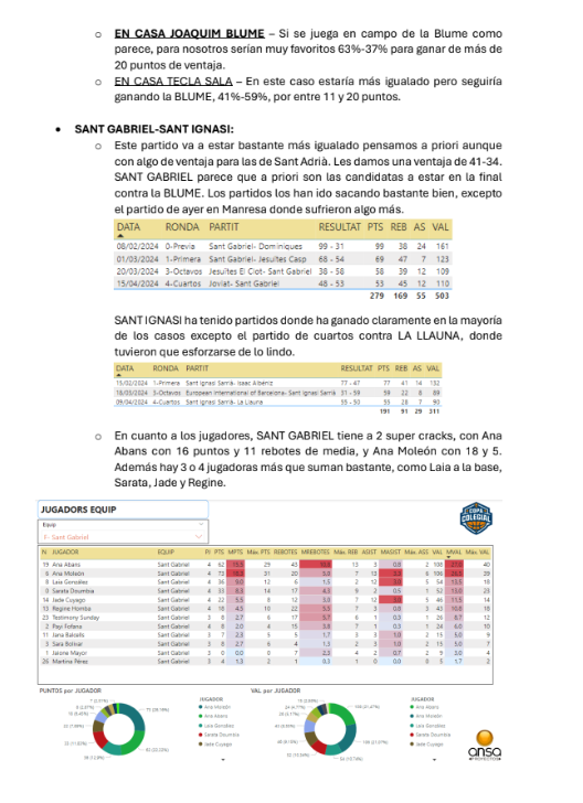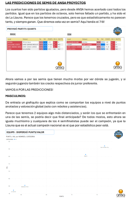 Ya tenemos las predicciones de ANSA de las semifinales de la Copa Colegial Barcelona, tanto en categoría masculina como en femenina. Tras un 22/24 en acierto en las rondas anteriores (91'67%), ahora se la juegan con los 4 duelos, mojándose como nunca. No os perdáis su resumen (¡de 9 páginas!) que adjuntamos a continuación: