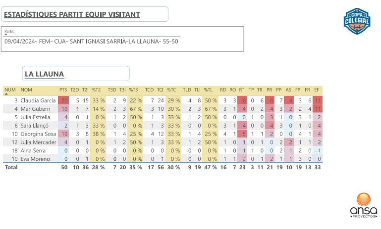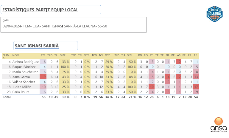Una jornada más, nuestro equipo de estadística formado por ANSA nos deslumbra con la mejor estadística 5D en Copa Colegial, desgranando todos los apartados estadísticos de las jugadoras de La Llauna y Jesuïtes Sarrià, disputado ayer tarde en motivo de los cuartos de final de la Copa Colegial Barcelona. Ahí van: