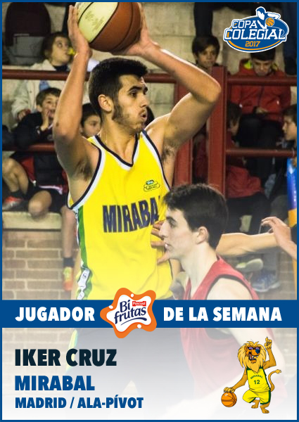 Es una despedida con sabor agridulce. Iker Cruz Oraá , el formidable ala pìvot de Mirabal se despide de la Copa Colegial con una actuación ante Escolapios, (18 pts, 25 rbts , 2 as.) de las que nos ha tenido acostumbrados desde que debutó en 2015 y con un nueva elección como Jugador Bifrutas de la Semana que se une a las del 2015 y 2016 .