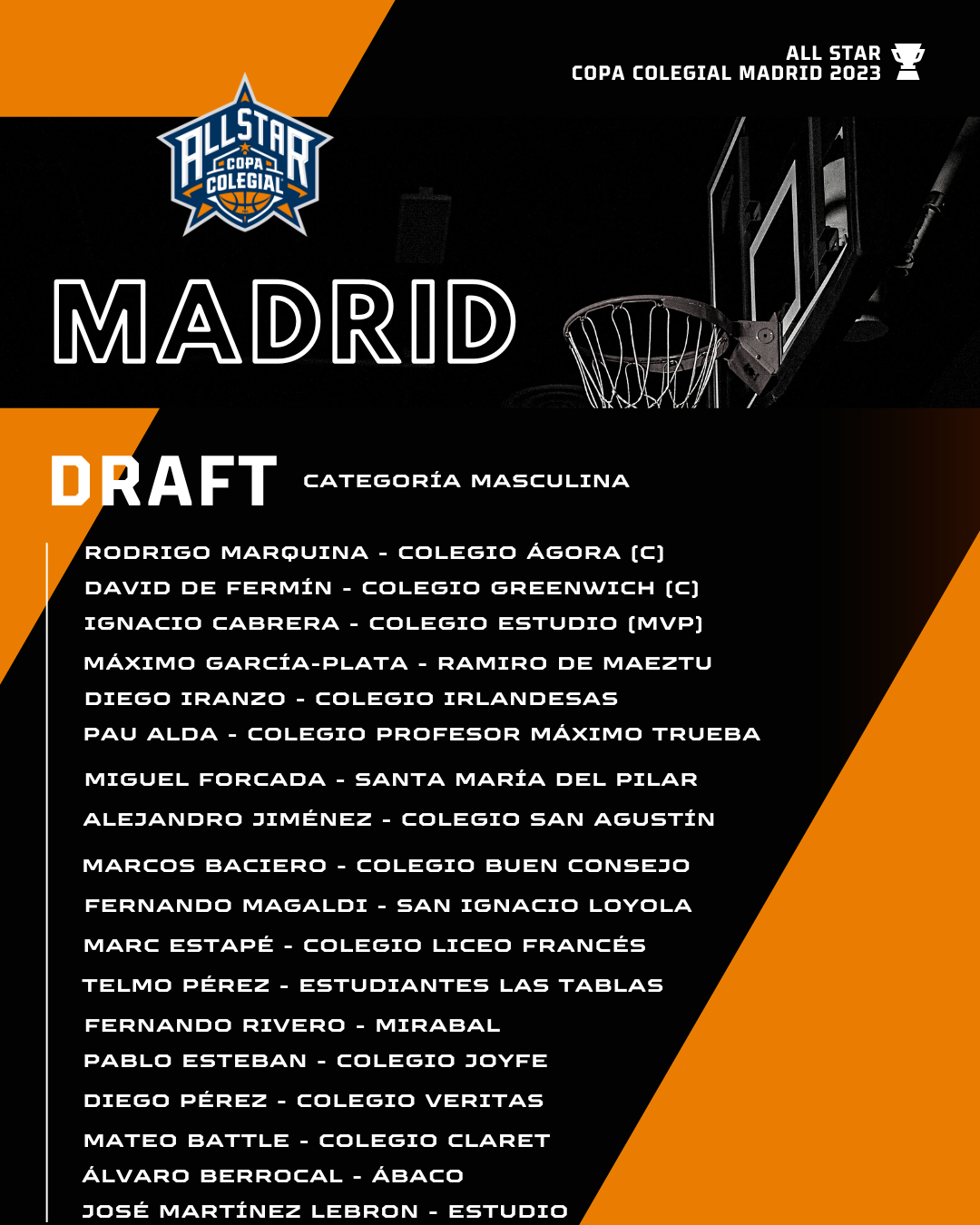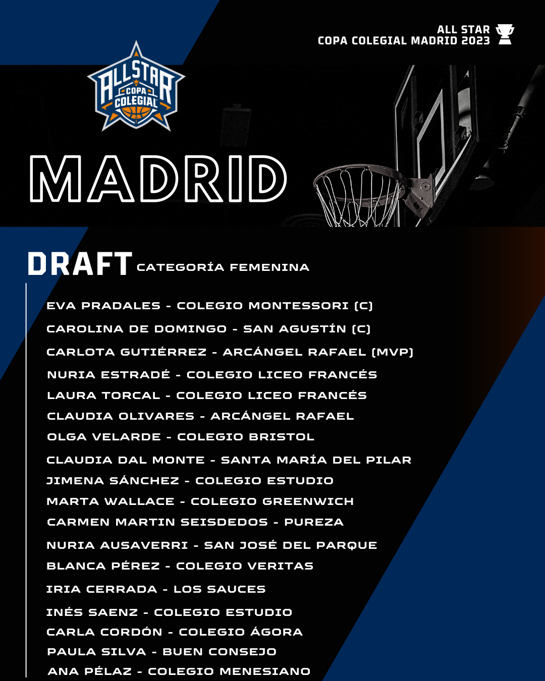 Esta noche, antes de dormir (23:00 horas), tienes una cita en Twitch. El All-Star de la Copa Colegial Madrid está la vuelta de la esquina, y para ello en esta edición de 2023 vamos a realizar un formato de selección muy especial. A todos los jugadores elegidos, (en total 36, 18 masculinos y 18 femeninos), se les ha posibilitado ser nombrados capitanes de ambas conferencias.