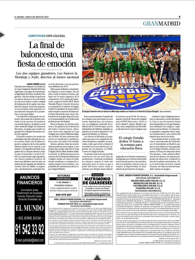 Estamos ilusionados con lo vivido este año en la Copa Colegial 2022. El curso de la fase final nacional en L'Alquería del Basket de Valencia está teniendo un seguimiento masivo... como podemos ver en los medios de comunicación. Y por ejemplo, uno de ellos es uno de los más prestigiosos a nivel nacional, como es El Mundo.