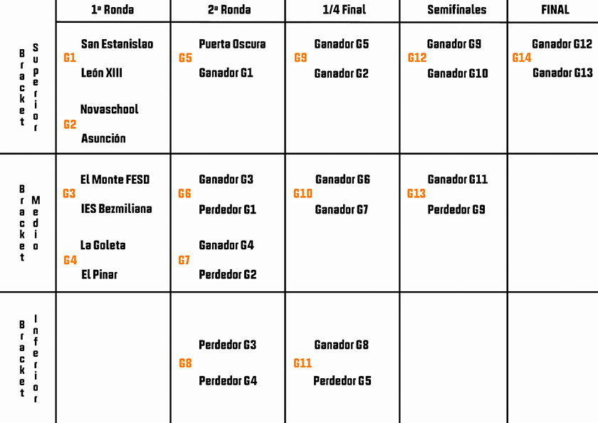 Hay que estar muy atentos porque el cuadro está organizado en modo bracket con varios niveles en función de la trayectoria de cada uno de los colegios... ¡tal y como se hace en los impresionantes torneos de e-sports! Aunque pueda sonar complicado y lioso... la clave está en que colegio que pierda, bajará de nivel. Todos y cada uno de ellos jugarán, mínimo, dos encuentros, en los que tendrán opciones de volver a subir niveles jugando repescas.