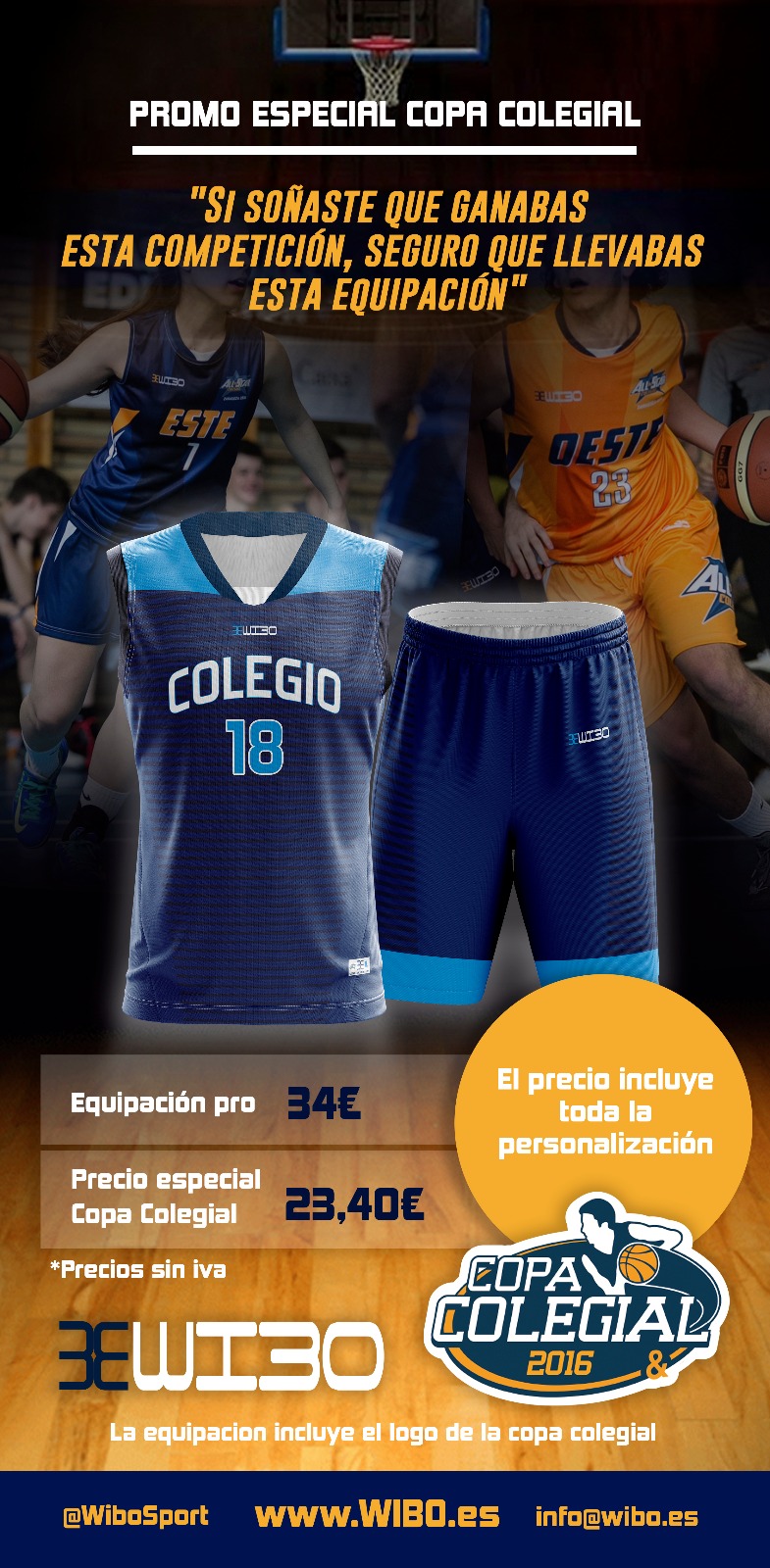La Fundación Baloncesto Colegial y WIBO, tras la firma del acuerdo de colaboración para estas tres próximas temporadas, te traemos una oferta exclusiva para todos los colegios que participan en la Copa Colegial y que de esta forma podrán disfrutar de una equipación completa y totalmente personalizada para disputar este torneo tan especial como se merece.