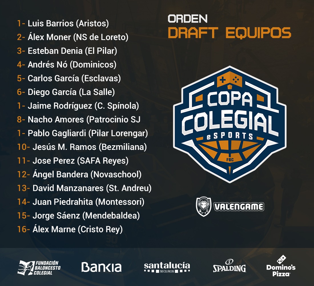 Una vez conocidos los 16 finalistas, se ha realizado el draft para que cada uno de ellos eligiera al equipo con el que quiere jugar la fase final. Se ha realizado un sorteo para determinar el orden de elección y posteriormente, a través de nuestra cuenta de Instagram, cado uno de ellos ha podido decidir con qué equipo va a participar. En la imagen podemos ver cuál ha sido el orden de elección y qué jugadores han tenido mejor o peor fortuna de cara al potencial de su equipo durante la competición.