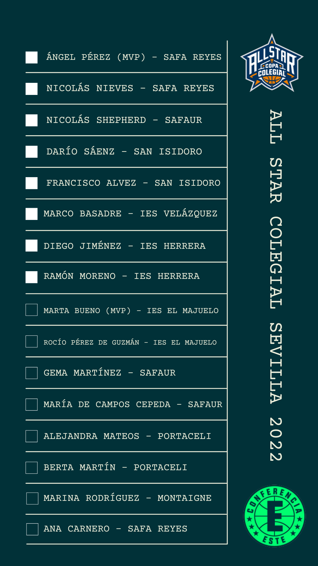 Dieciséis jugadores por conferencia. Ocho chicos y ocho chicas. En la conferencia ESTE coinciden además los dos Mejores Jugadores de la Copa Colegial Sevilla 2022. Marta Bueno, del IES El Majuelo, ganadora también del mismo galardón en 2019, y Ángel Pérez, de Safa Reyes, serán las megaestrellas, pero estarán muy bien acompañados por jugadores y jugadores de Safaur, San Isidoro, IES Velázquez, IES Fernando de Herrera, Portaceli y Montaigne. ¡BOOM!