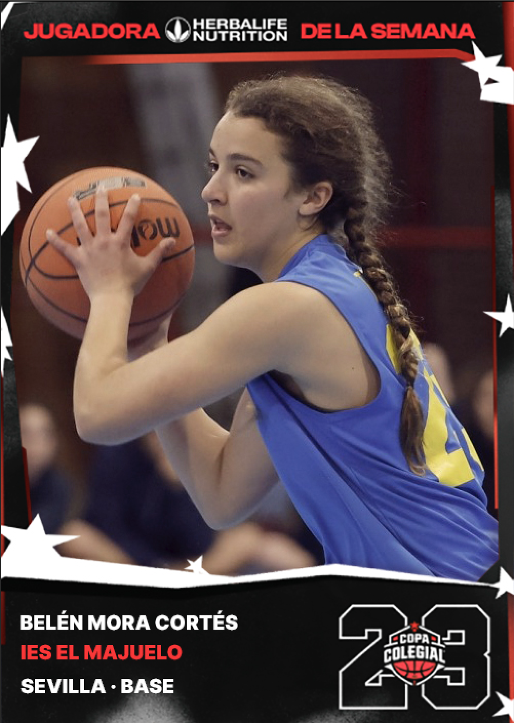Es evidente que el IES El Majuelo va a imprimir con letras de oro –si no lo ha hecho ya– su nombre en la historia de la Copa Colegial Sevilla. En tan solo dos participaciones ha cosechado dos estandartes y Marta Bueno –ya retirada– ha ganado en ambas ocasiones el trofeo a Mejor Jugadora del torneo. En 2023 busca su tercer estandarte consecutivo y lo hace con nuevas estrellas. Una de las que brilla con más intensidad es Belén Mora Cortés, Jugadora Herbalife Nutrition de la 4ª Semana de la Copa Colegial Sevilla. ¡Enhorabuena!