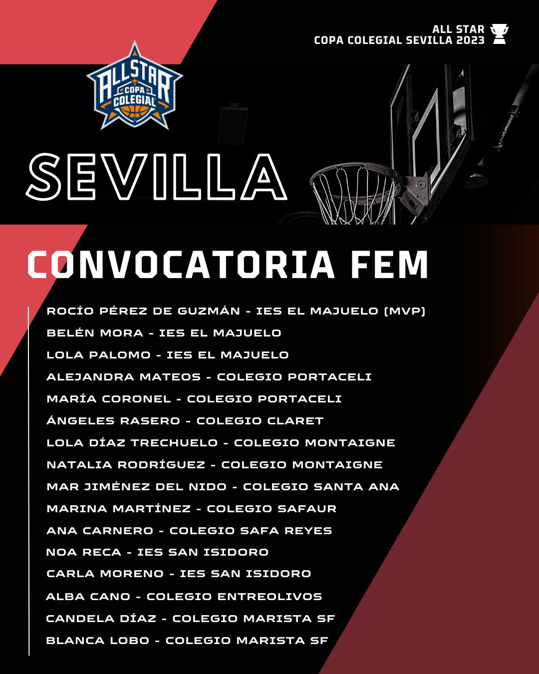 Esta es la convocatoria oficial para el All Star Copa Colegial Sevilla 2023. Dieciséis jugadores y dieciséis jugadoras que se lucirán para las conferencias ESTE y OESTE en el partido de las estrellas. La ciudad se divide en dos para ver sobre la pista a los treinta y dos mejores baloncestistas de la Copa Colegial Sevilla 2023. ¡Cómo suena eso! Un partido que se disputará el viernes 5 de mayo de 2023 (horario por confirmar) en el pabellón del Colegio Santa Ana.