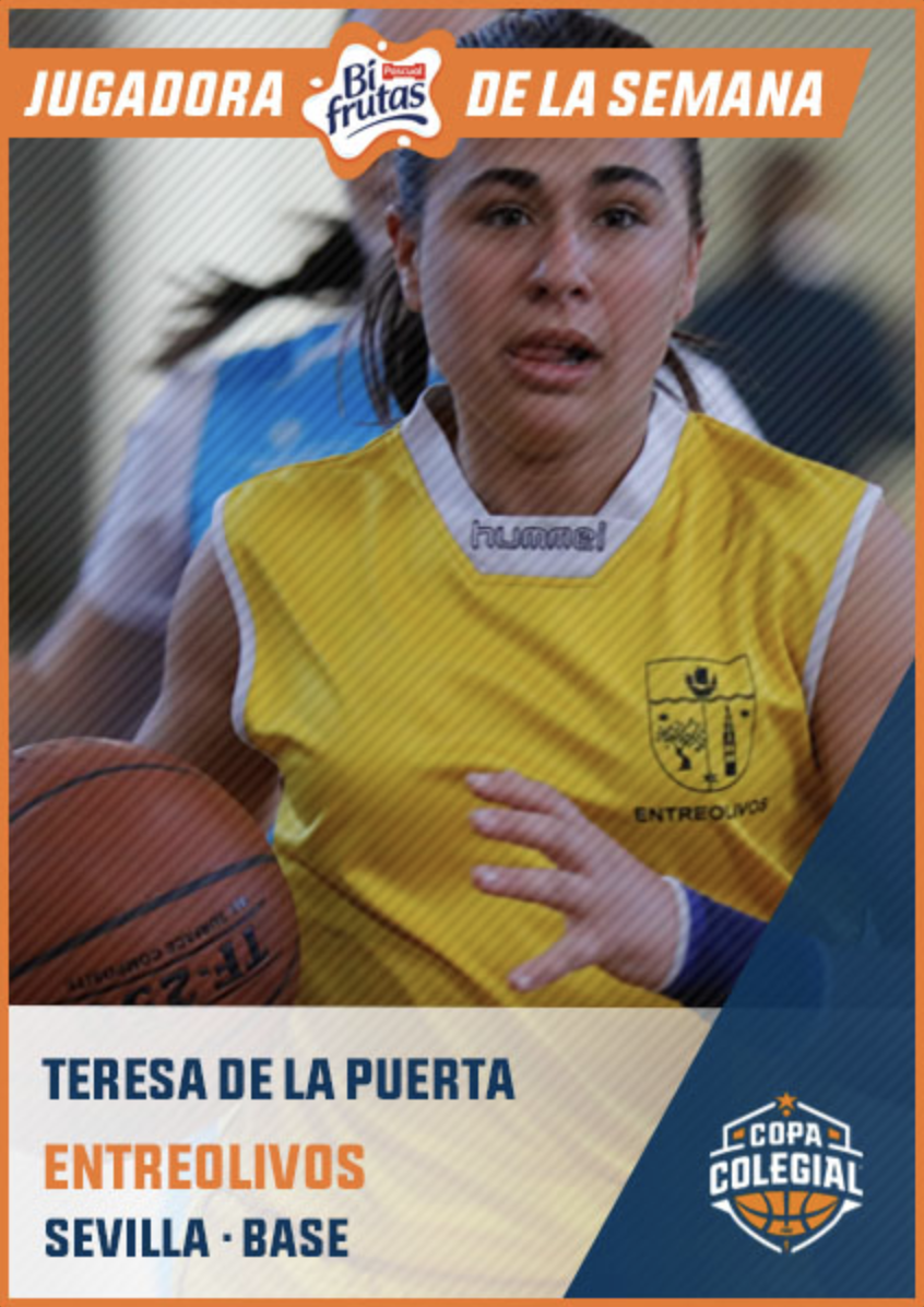 Quien ha visto jugar alguna vez a Teresa de la Puerta Valdecantos sabe que es nervio en estado puro. Base eléctrica nacida en 2001. Velocidad, reflejos y mando, mucho mando. Su carácter ganador queda impreso entre ceja y ceja en el resto de sus compañeras. Sin lugar a dudas, es una de las líderes de Entreolivos, colegio campeón de la Copa Colegial Sevilla 2018 en categoría femenina. Teresa de la Puerta no deja una pelota por perdida. Competitividad a raudales. Ganar, ganar y ganar. Solo hay una opción en su cabeza. En su partido de cuartos de final ante Esclavas comandó la victoria de su equipo con doce puntos, siendo la máxima anotadora, por delante de Andrea Gascón de Luna –MVP Copa Colegial Sevilla 2018– y Esperanza Sánchez Pérez. Con el dorsal 15 a la espalda fue un destello amarillo imposible de parar por la defensa rival. Un encuentro sobresaliente que le ha llevado a brillar en esta ronda del torneo.