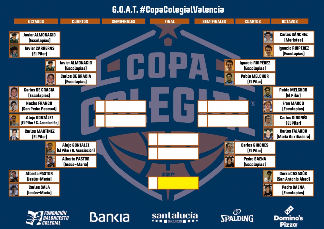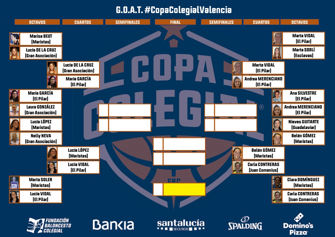En las últimas cuarenta y ocho horas se ha disputado la ronda de octavos de final del G.O.A.T. (Greatest of all time) de Copa Colegial Valencia, tanto el cuadro masculino como el femenino y, sin duda, habrá habido algún resultado que haya sido sorprendente para los votantes. Pero, con la igualdad de curriculums colegiales que había en la pista virtual, estaba claro que cualquier cosa podía pasar. Casi 18.000 votos en las encuestas publicadas en nuestra cuenta de Instagram (@copacolegial) dan fe del interés que ha despertado la competición entre los aficionados valencianos de la Copa Colegial.