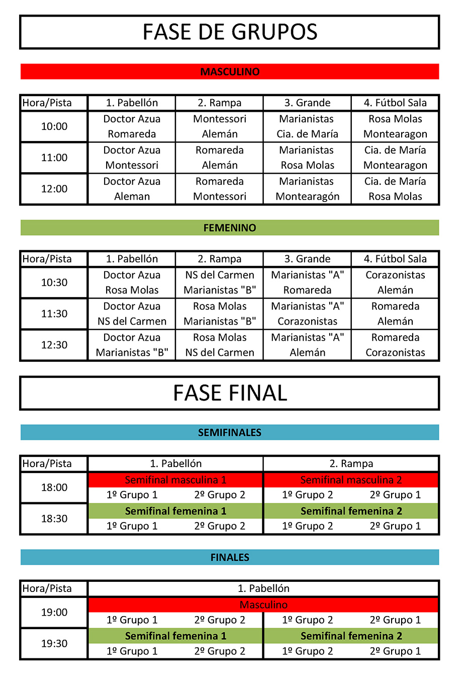 Grupo 2: Leones Marianistas, Hipos Compañía de María, Pandas Rosa Molas y Torreones Montearagón.