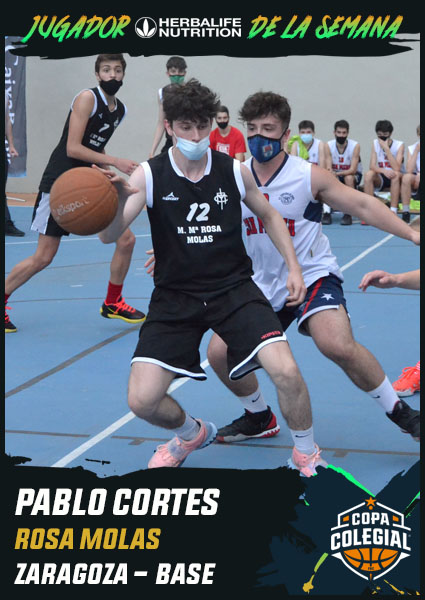Pablo Cortés ha sido elegido Jugador Herbalife Nutrition de la semana tras la disputa de la Gran Final masculina. Otro base de mucha calidad, referencia en la creación de juego de los Pandas e importantísimo en el juego de ataque. Pablo ha demostrado, a lo largo de todos los años en los que ha jugado la competición, ser un líder básico para su equipo. Porque, si de Natalia comentábamos su juventud y futuro, Pablo cierra su ciclo colegial con el premio de haber llegado a la Gran Final aunque, en el partido decisivo, los campeones de Romareda Rinos no les dieron opción a la victoria. El balance de Pablo es ilusionante, contando en su palmarés colegial con una semifinal y una final disputadas. Un éxito para unos Pandas Rosa Molas que han crecido en los últimos años de forma exponencial. Pablo Cortés cerró su etapa en la Copa Colegial deleitándonos con un partidazo en el que anotó 17 puntos, máximo anotador de la Gran Final y resultando también como el mejor anotador (con diferencia) de la Copa Colegial Zaragoza 2021, 47 puntos totales, lo que supone una media de 15,7 por partido.y siendo, también con diferencia, el jugador mejor valorado de la competición. Solamentele faltó la guinda del Estandarte para alcanzar el olimpo colegial pero, sin duda, en unos años hablaremos de él como uno de los jugadores que han dejado una huella profunda en la competición.