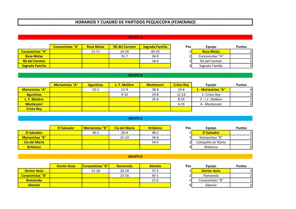 En la parte femenina, las locales de Pandas Rosa Molas aceedían a semifinales tras un triple empate en el Grupo 1 con Cañoneras Corazonistas y Nuestra Señora del Carmen que debió de decidirse por la diferencia de puntos a favor y en contra. En el Grupo 2, el más duro puesto que estaba compuesto por cinco equipos, Leonas Marianistas ejercieron de reinas de la selva colegial, venciendo con superioridad a todos sus rivales. Canguras El Salvador apuntaban ya alto en el Grupo 3, también con victorias ante todos los rivales. Por último las vigentes campeonas, Doctor Azúa, lideraron el Grupo 4, logrando victorias ante Romareda Rinos, Cañoneras Corazonistas y Panteras Alemán.