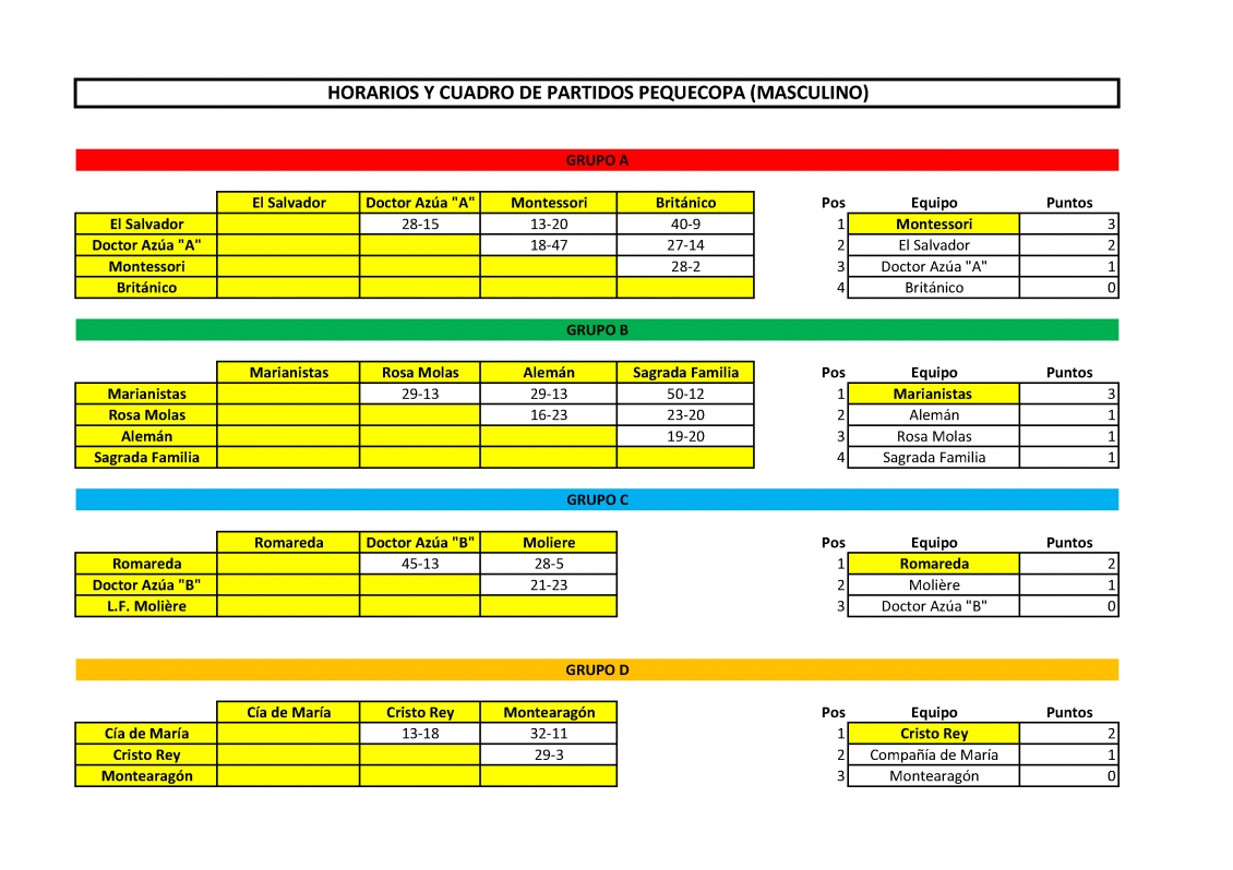 La mañana comenzó con la fase de grupos, en la que los primeros clasificados de cada uno de ellos, cuatro masculinos y cuatro femeninos, pasaron a la fase eliminataria que se jugó por la tarde. Algunos de los favoritos, como los chicos de Doctor Azúa, que había sido subcampeón en la pasada edición, cayeron en esta fase sorprendidos por el alto nivel de sus rivales del Grupo 1, en su caso, el de unos Gladiadores Montessori que fueron sin duda la revelación la Pequecopa, superando a dos de los favoritos en su grupo: Azúa y Canguros El Salvador. En los Grupos 2 y 3, Leones Marianistas y Romareda Rinos cumplieron con su condición de cabezas de serie y pasaron a semifinales con pleno de victorias, mientras que en el Grupo 4, Cristo Rey se imponía a Hipos Compañía de María tras vencerle en el duelo directo que decidió quién se clasificaba.