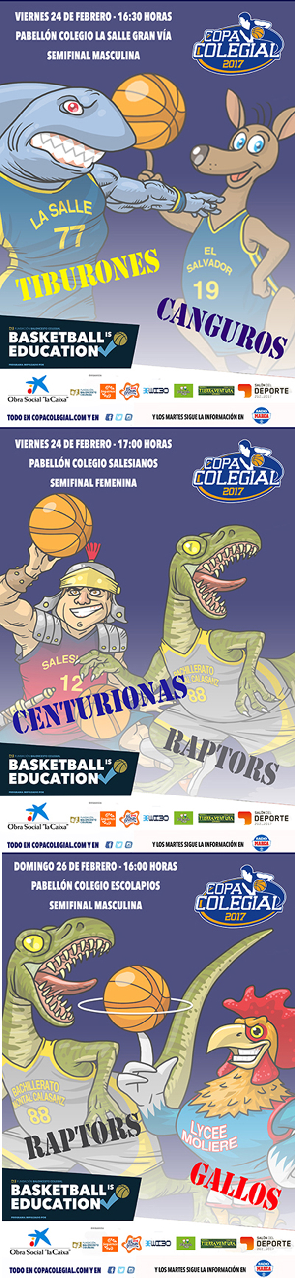 El Bachillerato Montal Calasanz es el único colegio que en esta edición ha sido capaz de meter a sus equipos masculino y femenino en las semifinales. Entrenados ambos conjuntos por Nacho Herce, los Raptors reciben en su pabellón a los Gallos. Será sin duda un partido plagado de emociones y reencuentros, sin un pronóstico claro entre dos de los equipos que mejores sensaciones han ofrecido en los partidos anteriores. Dos equipos físicos, que dotan a los partidos de un alto ritmo de juego y con varios "jugones" en su plantilla que, si tienen el día acertado, pueden decidir el resultado ante cualquier rival.